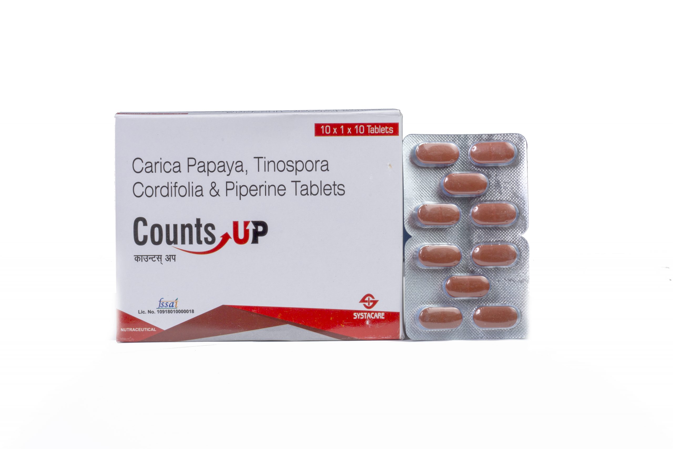| COUNTS UP TAB | Carica papaya 1100mg+Tinospora 50mg+Piperine 5mg | 10 x 10 (Alu-Alu) |