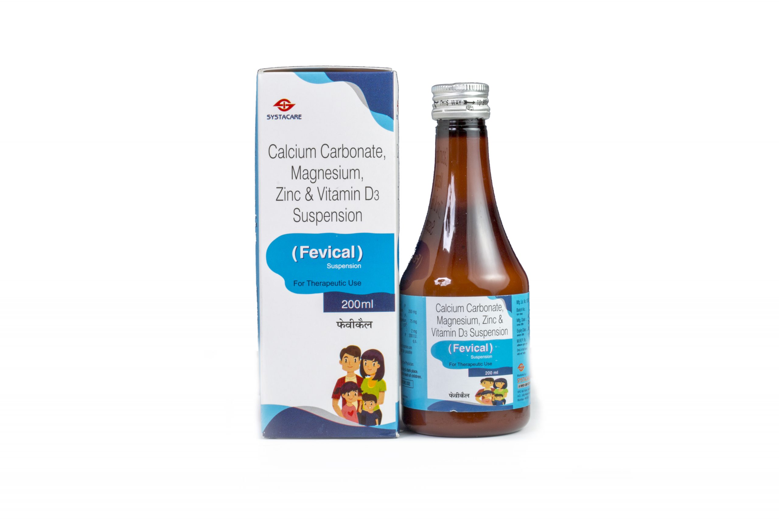 | FEVICAL SYRUP | Calcium carbonate eq. to elemental carbonate 250mg+ magnessium hydroxide ip eq. to elemental magnessium 75mg + zinc gluconate 2mg+ vitamin d3 200iu | 1x200ml |
