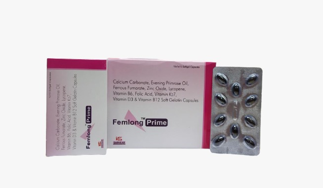 | FEMLONG PRIME SOFTGEL | Each soft gelatin capsule contains: Calcium Carbonate 250 mg, Evening Primrose Oil 220 mg, Soya Isoflavonoids (40%) 80 mg, Calicium Pantothenate 50 mg, Ferrous fumerate eq. toelemental iron 12mg, Zinc Oxide eq.to elemental zinc 12mg, Lycopene 6% 5mg, Manganese Sulphate eq. to elemental Manganese 5mg, Vitamin B6 2mg, Copper Sulphate eq. to elemental Copper 1mg, Folic Acid 200 mcg, Vitamin k2-7 50 mcg, Selenium Dioxide eq. to elemental Sele nium 40 mcg, Chromium Picolinate eq.to elemental Chromium 35 mcg, Vitamin D3 200 IU, Vitamin B12 1mcg Excipients q.s | 10 X 1 X 10 (BLISTER) |